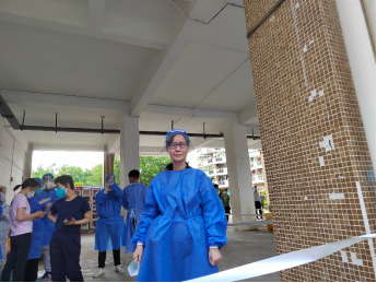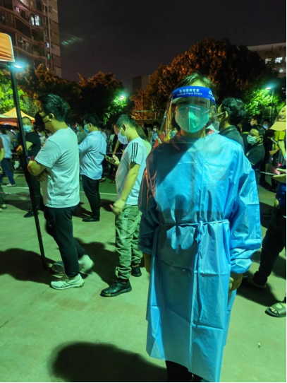防疫无小事,党员当觉悟。虽然才术后不久,但社区征集核酸检测志愿者的时候,我还是积极参加了。我们穿着密封的防护服,带上隔离病毒面罩,指引群众排队、扫码、出示健康码等,保证社区的全员核酸检测有序、安全和科学进行。有些老人家不会使用手机,我们就耐心地帮忙扫码和填写资料。对于老人、孕妇、小孩以及残障人士,我们设置爱心通道,使其快速、便利地完成核酸检测。天气炎热,几个小时下来,我们已满身是汗,嗓子沙哑,腿也很酸,但是耳边常能听到群众说“谢谢,辛苦了”,这时我们就知:抗疫虽艰,人间值得;不能躺平,生命至上!广州加油,广州必胜!