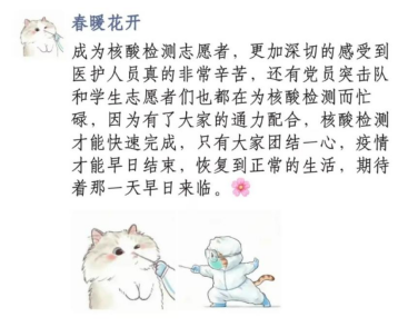疫情当前,每一个人都可以作出自己的一份贡献,就像鲁迅先生所说:“有一份热,发一份光,就如萤火一般,也可以在黑暗里发一点点光,不必等待火炬。”其实,每一个人在疫情面前都做出了贡献,大家遵守学校防疫要求,有能力的积极参加防疫志愿者。在此次的志愿活动中我也深刻感受到了医护人员的不易,向所有“逆行者”们致敬!