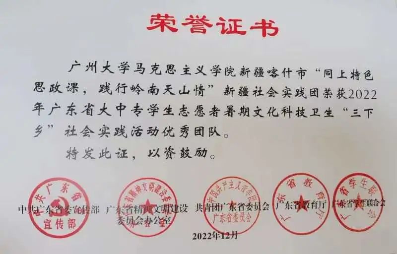 民族团结实践团获评为2022年广东大中专学生志愿者暑期文化科技卫生“三下乡”社会实践活动全国重点团队。