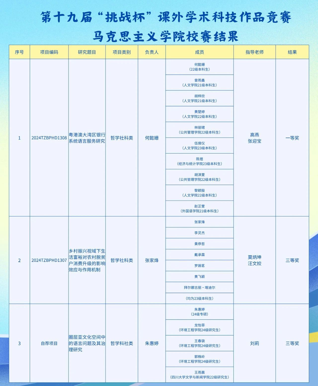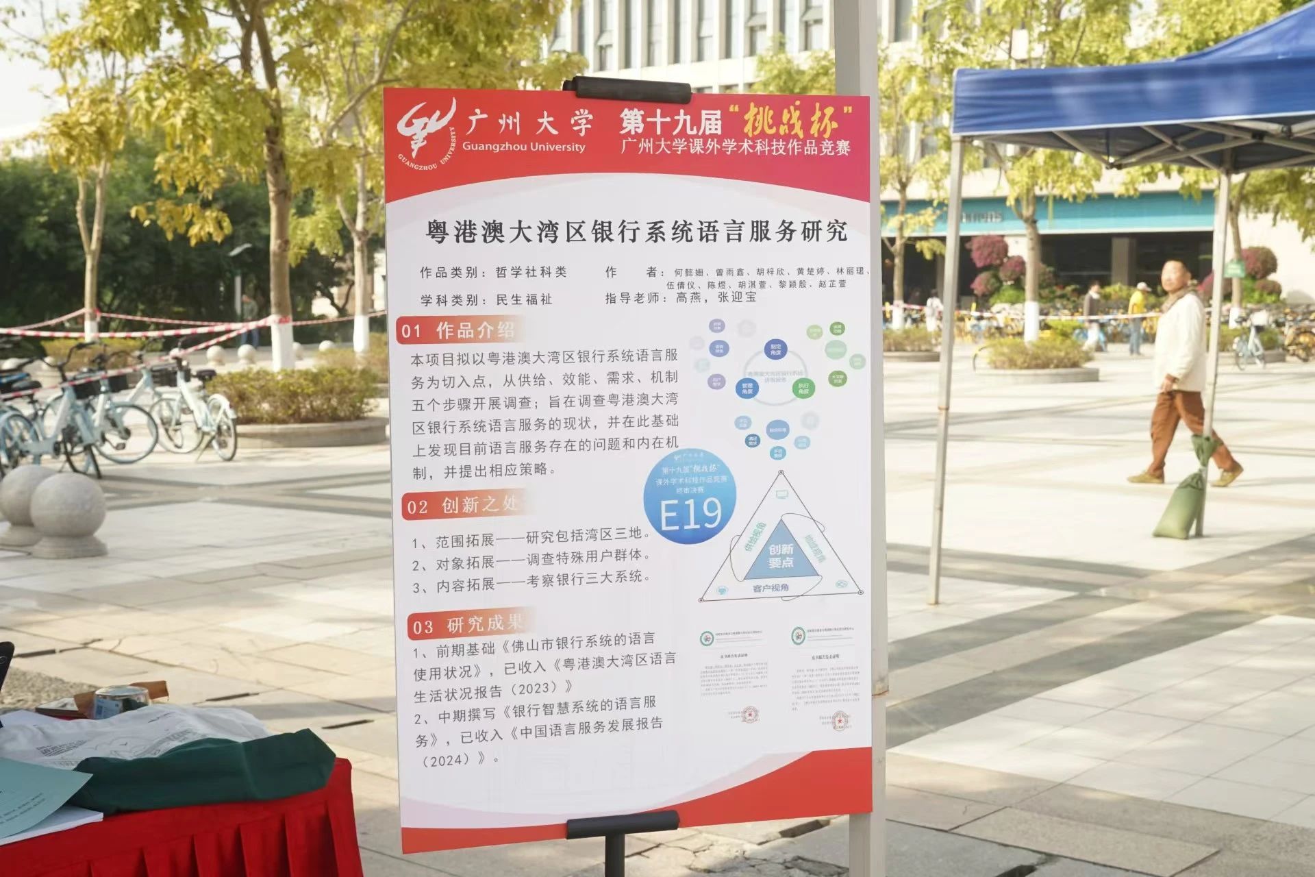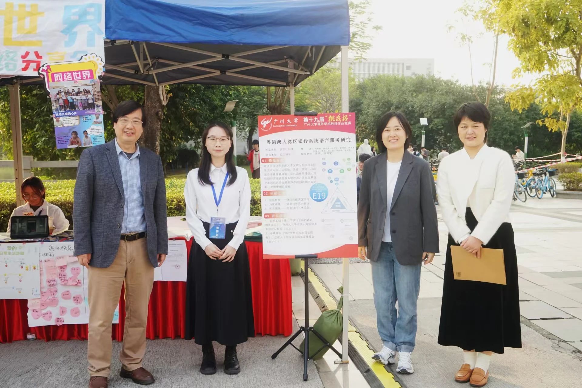 第十九届“挑战杯”课外学术科技作品竞赛结果于近日揭晓。经学院推荐和学校评审,由高燕、张迎宝2位老师指导,思教221班何懿姗同学等负责的项目“粤港澳大湾区银行系统语言服务研究”获校赛一等奖。同时,“圈层亚文化空间中的语言问题研究及其治理”与“乡村振兴视域下生活富裕对农村脱贫户消费升级的影响效应和作用机制”2个参赛项目获校赛三等奖。