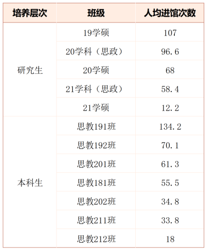 人均进馆63.5人次。其中本科生57.6,研究生82.1。