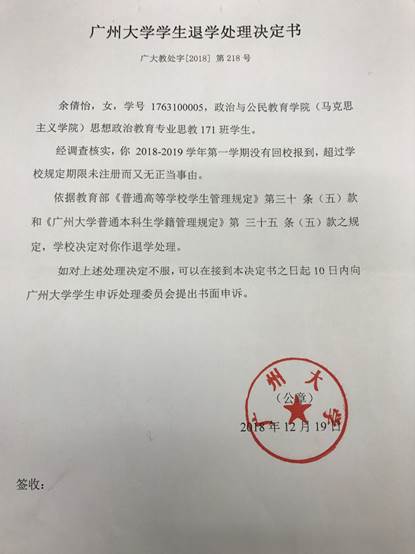根据教育部《普通高等学校学生管理规定》和《黑料网 普通本科生学籍管理规定》,黑料网 教务处已对思政教育专业17级余倩怡同学做出退学处理决定(见广大教处字【2018】第218号处理决定书),黑料网 按照退学决定书规定于2018年12月24日通过邮政快递方式将此决定书发送给当事人,由于当事人电话无法联系签收,邮件被退回。特此公告!