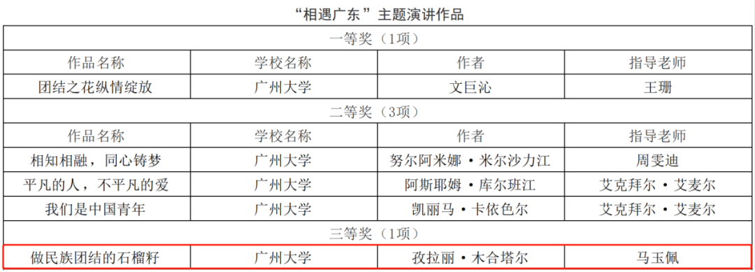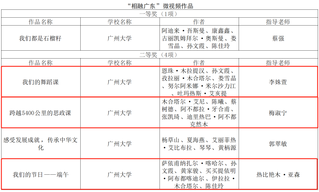 学生申报和参与的作品获奖4项,含“相融广东”微视频作品二等奖3项,“相遇广东”主题演讲作品三等奖1项。