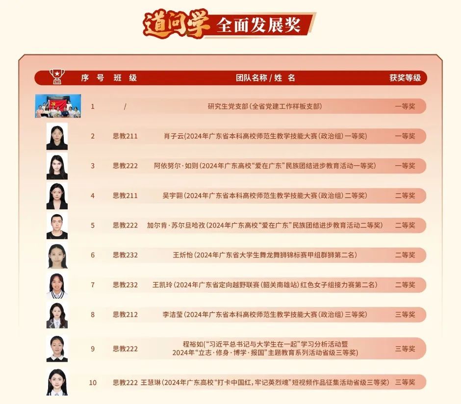 “道问学”全面发展奖获奖学生名单