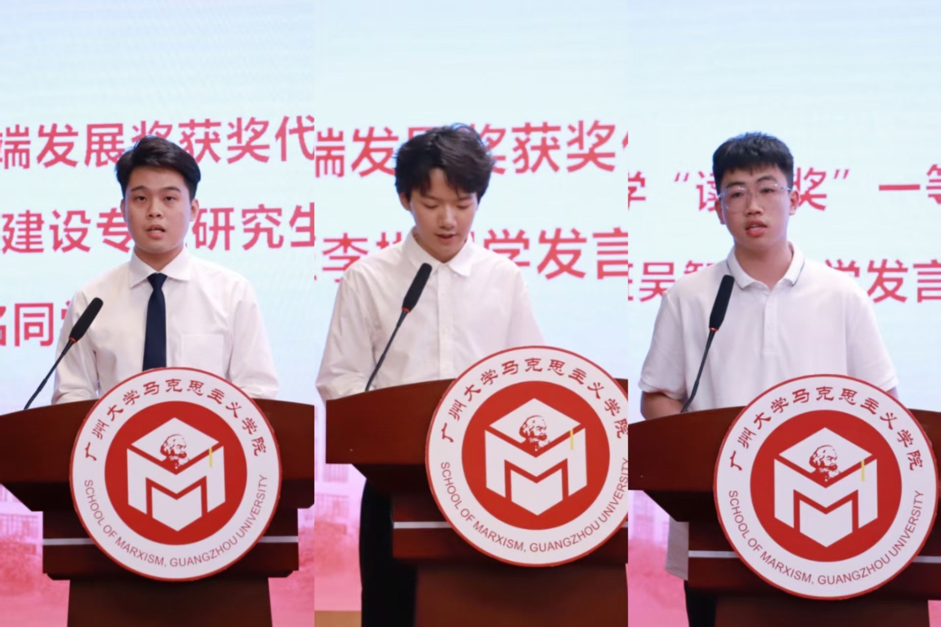 硕士毕业生代表朱建铭同学、本科毕业生代表李彬同学以及在校生代表吴智乐同学依次上台发言。他们对栽培自己成长的学院老师们表达了感恩之情,分享了自己的求学路上的所感所悟,并为师生送上衷心的祝福。