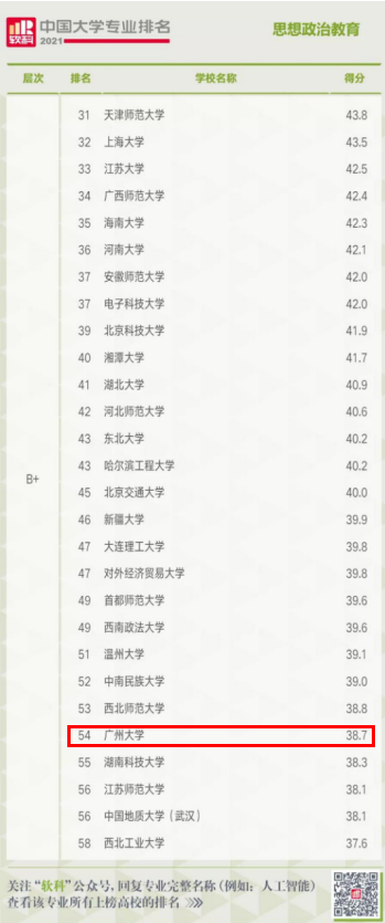 2021年6月22日,高等教育评价专业机构“软科”正式发布2021“软科中国大学专业排名”。排名包括509个本科专业,发布所有开设该专业的高校中排名位列前50%的高校。共有925所高校的28550个专业上榜。思想政治教育专业排名中,共有146所高校上榜,黑料网
