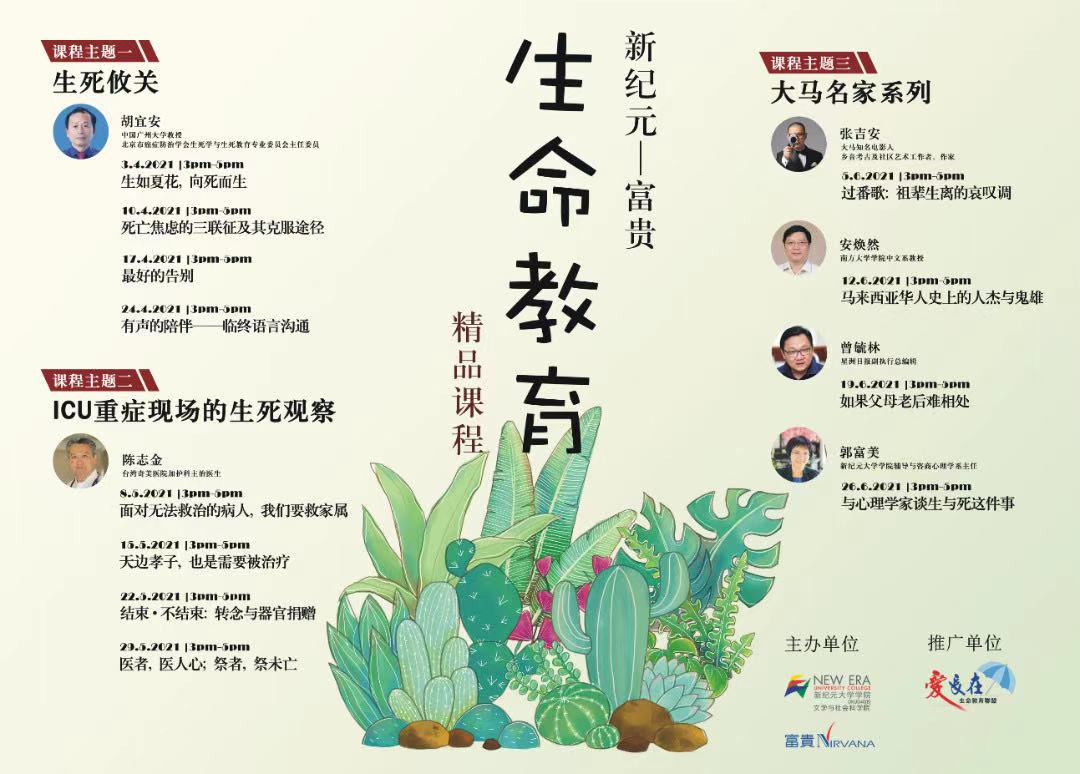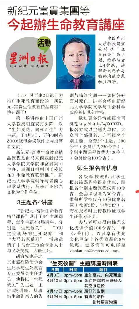 胡宜安教授受邀参与马来西亚“新纪元-富贵——生命教育精品课程”的授课。该课程是马来西亚华人企业富贵集团与马来西亚新纪元大学联合推出的一项生死教育项目。马来西亚华人受中国传统影响,普遍存在着推广生死教育的客观必要,且目前东南亚新冠肺炎疫情肆虐,人们迫切需要生死教育的引导,因此本课程具有重要的现实意义。