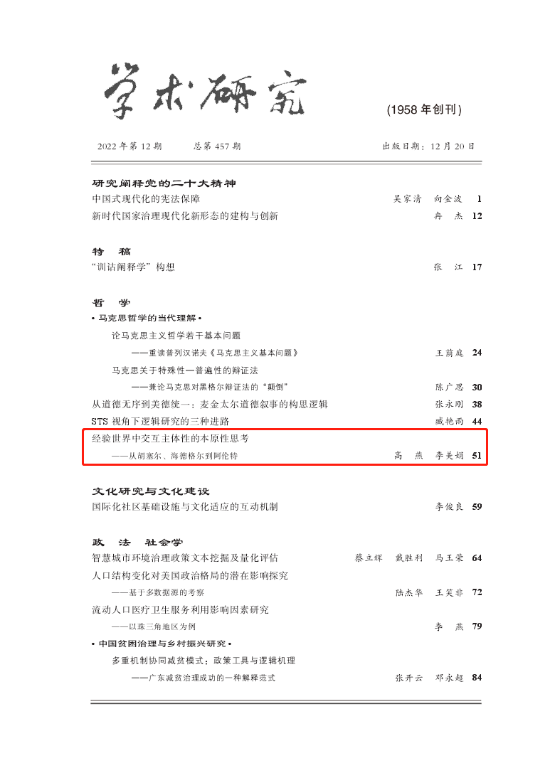高燕博士、研究生李美娟论文《经验世界中交互主体性的本原性思考——从阿伦特、海德格尔到胡塞尔》