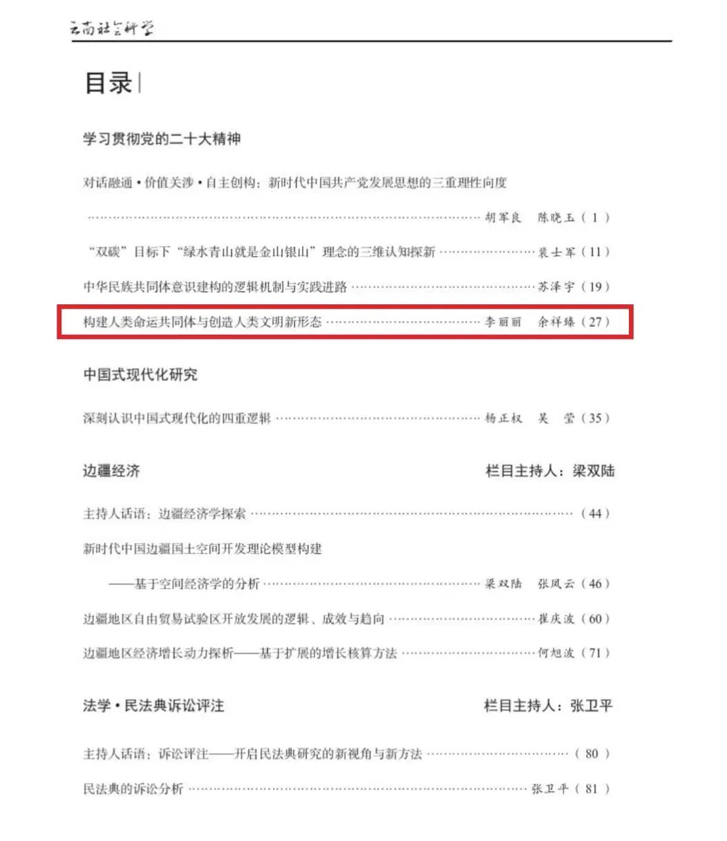 李丽丽副教授、研究生余祥臻论文《构建人类命运共同体与创造人类文明新形态》。